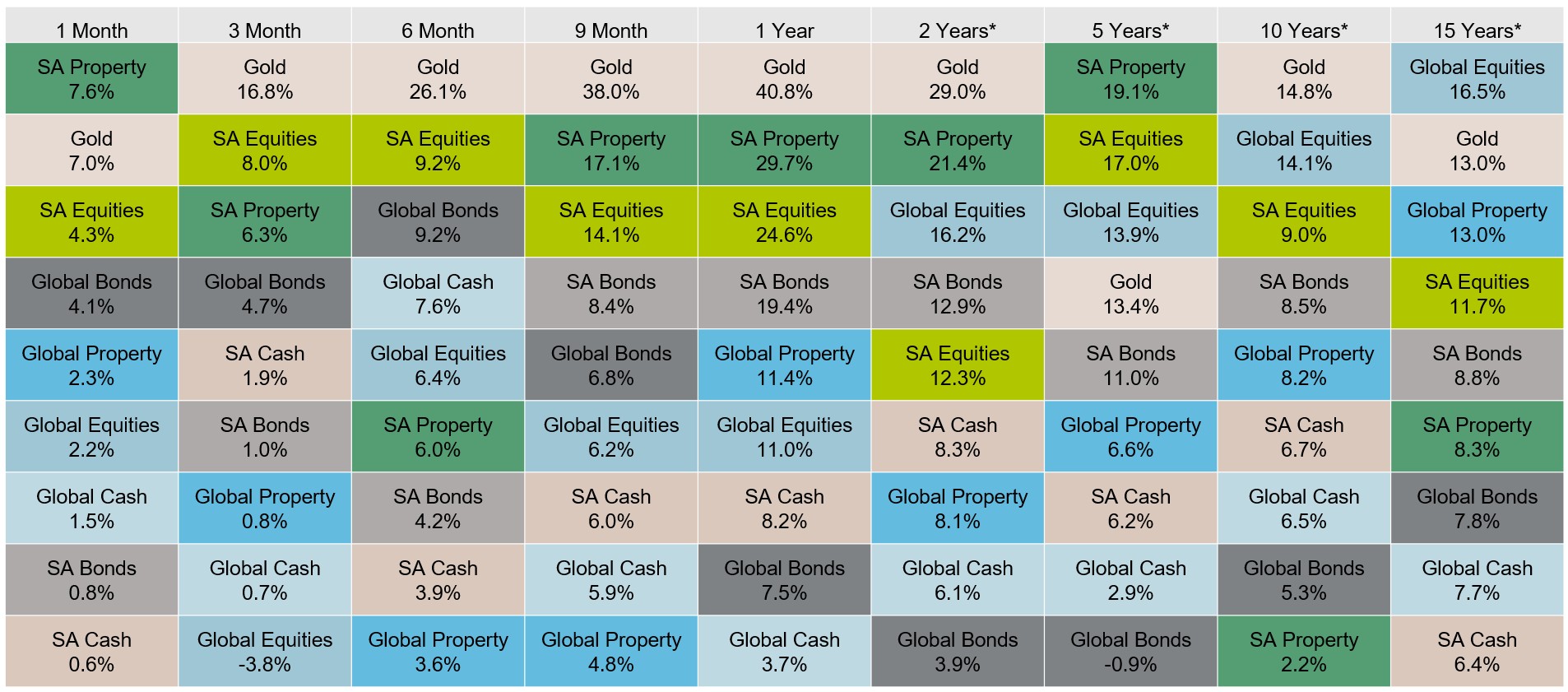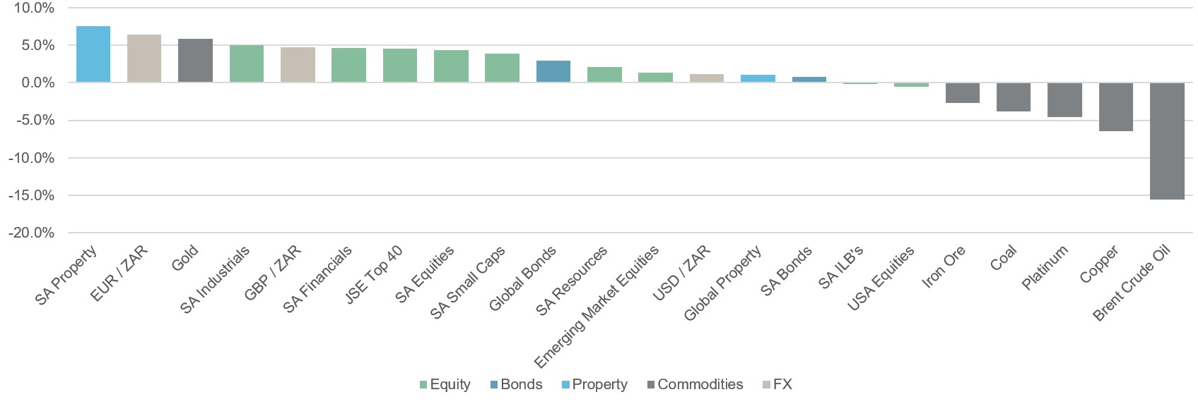 - SA Nominal Bonds (up 0.8%) crept higher again over the month as bond yields continued to move higher, while Inflation-Linked Bonds were negative, down 0.1%.