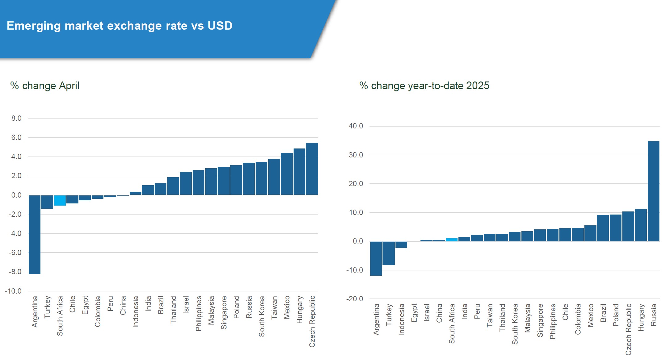 Consumer confidence plunged to multi-year lows, and the rand remained under pressure amid ongoing political and fiscal ambiguity. Meanwhile, economic indicators painted a mixed picture. Retail sales and mining output disappointed, and leading indicators suggest a weakening growth outlook despite improved trade data and stronger reserves supported by elevated gold prices.