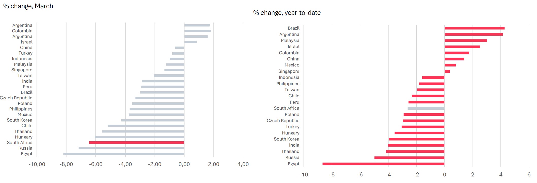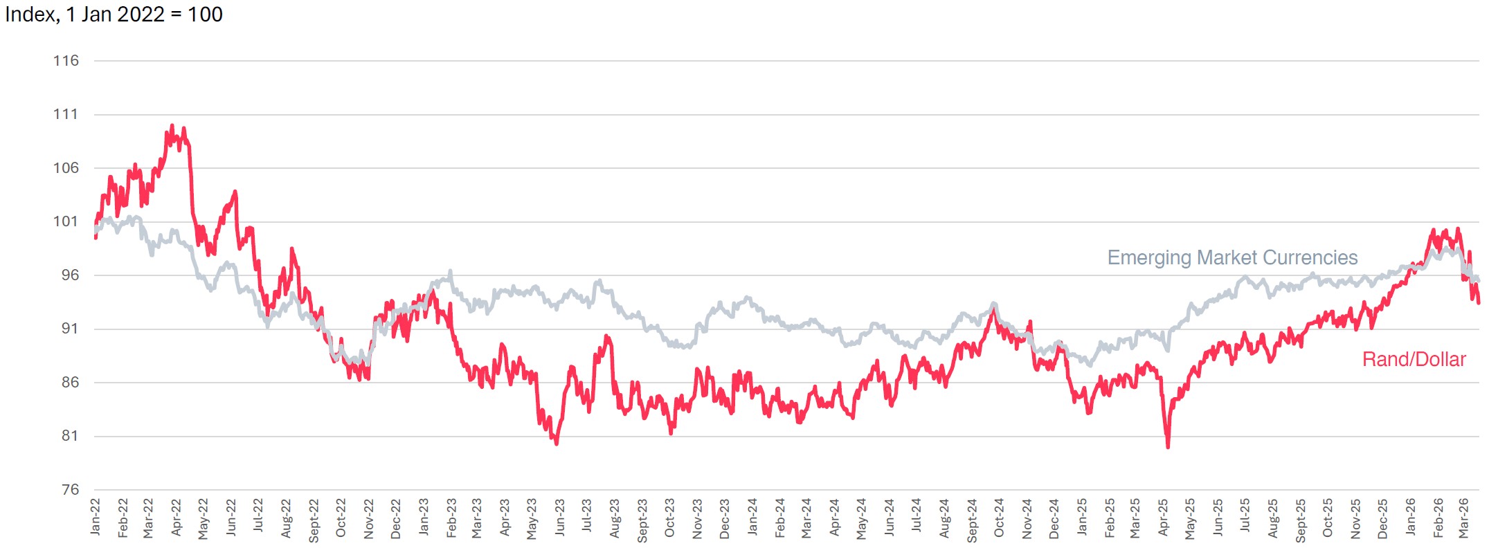 South African markets experienced one of their most difficult months in years as global risk aversion fed directly into local asset prices. Equities, bonds, and the rand all weakened sharply, despite no meaningful deterioration in domestic fundamentals. The transmission mechanism was clear: higher oil prices, a stronger US dollar, and reduced appetite for emerging‑market risk.