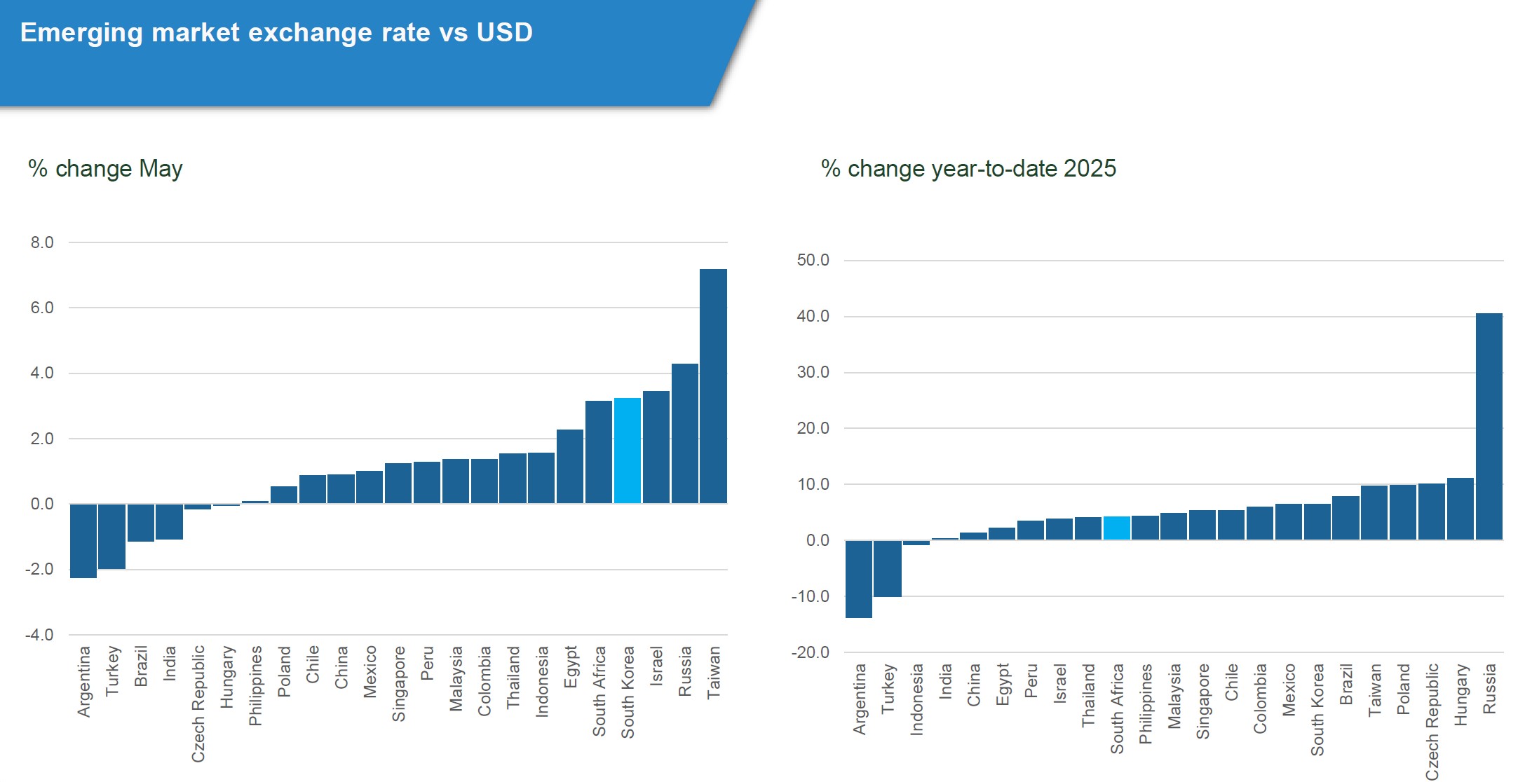 Yet, South African financial markets offered a silver lining. Equities outperformed their emerging market peers for the fifth consecutive month in rand terms, with all major sectors posting strong returns. Local bonds also defied global trends, delivering gains as investor confidence grew following the successful passage of the long-awaited Budget 3.0. Market sentiment was further buoyed by expectations—ultimately realized—of SARB’s rate cut, which provided a measure of relief to consumers and businesses alike.