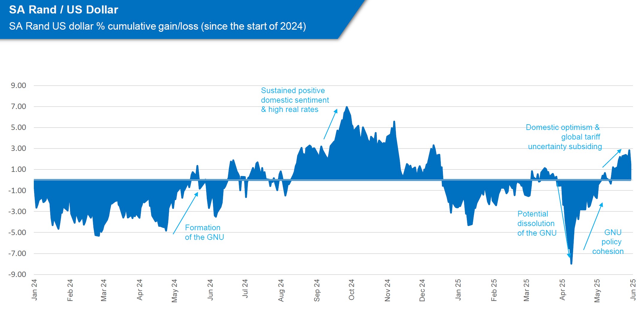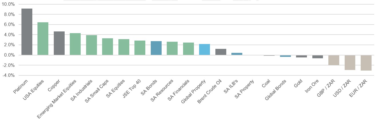 - SA Nominal Bonds (up 2.7%) delivered some strong returns as a consequence of improving sentiment surrounding the GNU, while Inflation-Linked Bonds were slightly positive, up 0.4%.