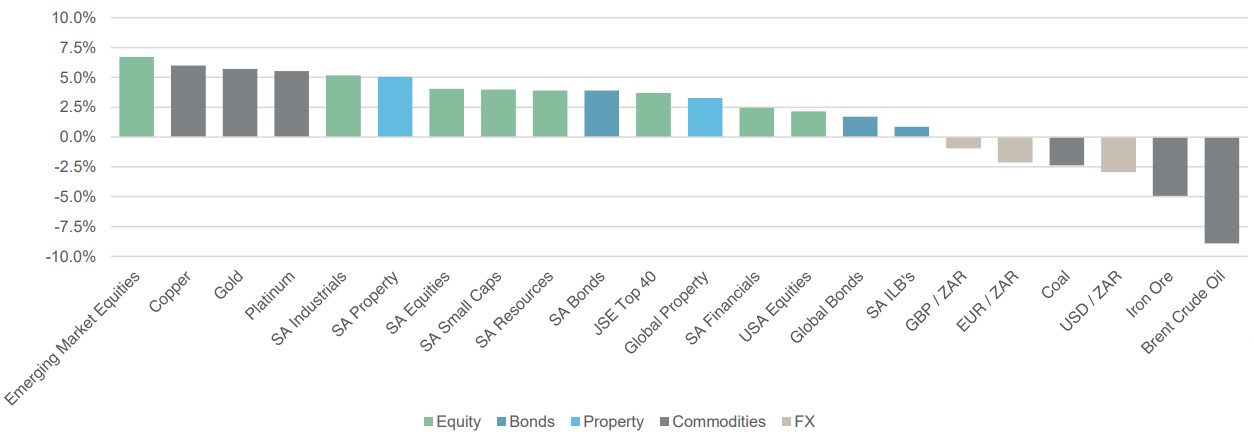 - SA Nominal Bonds (up 3.9%) saw large gains after the SARB cut interest rates, and Inflation Linked Bonds (up 0.9%) inched higher as inflation slowed.