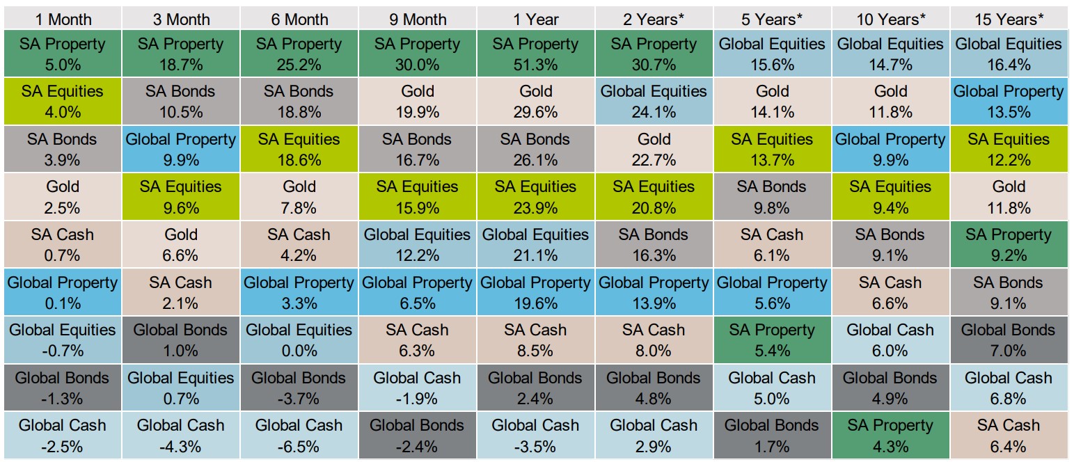 - The S&P SA REIT sector (up 5.5%) and the SA Listed Property sector (up 5.0%) continued to perform well and closed out the quarter as the best performing local asset classes.