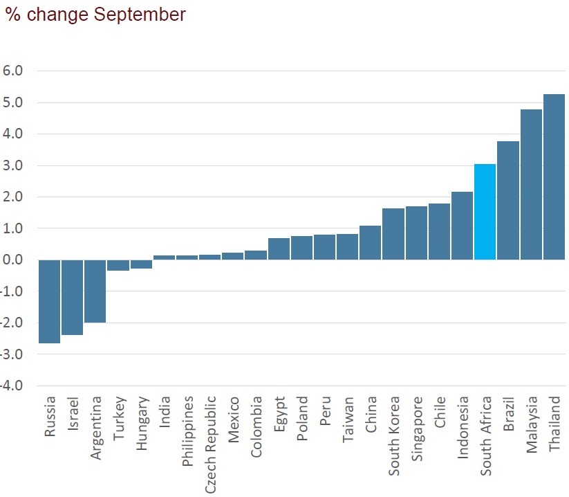 South African asset classes benefited significantly from global macroeconomic trends in September. A rally in China’s equity markets, driven by a government stimulus package, lifted local markets, particularly in resources and industrials.